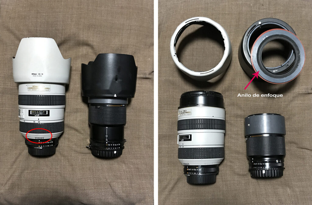 Ese número impreso dentro del círculo rojo corresponde a la fecha definitiva de la reparación. Aquí vemos los dos modelos mencionados, aunque en la derecha se ve el 35/70 recogido la diferencia de peso y volumen es importante. Anotar también que durante el tiempo que utilicé este 35/70 tuve que fabricarle un accesorio para poder instalarle un parasol para evitar entrada de luz lateral ya que como diré después este era su talón de Aquiles. Tengo que reconocer que junto con ese anillo que tiene el bordo rojo, fue una pequeña obra de ingeniería con la que podía enfocar en modo manual aún con el parasol puesto. Aclarar que este objetivo (35/70) no tiene ANILLO DE FOCO, es en el extremo delantero del objetivo donde se actúa para el foco, eso sí, muy preciso, ya que todo él está construido en aleación de aluminio, funciona muy suave y sin traba alguna.