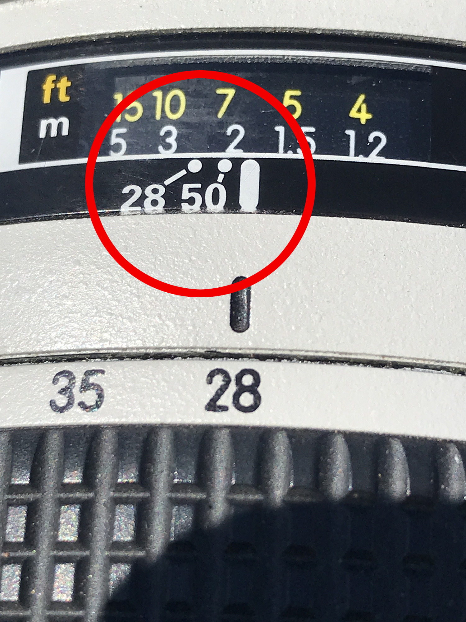 Para más “INRI” en el cuerpo del objetivo, en la ventana de la distancia había TRES MARCAS que correspondían a tres distancias focales. Foto de referencia.
