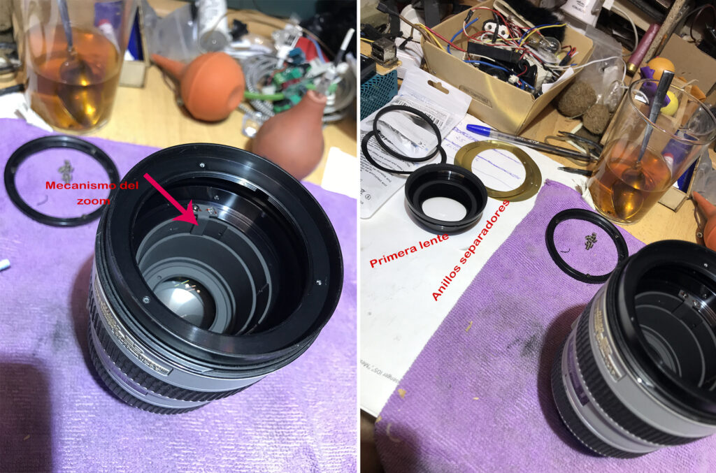 Como se pasaban los meses, incluso se pasó el primer año, sin resolver aquella incógnita, una tarde me propuse desmontar de nuevo el objetivo, pero no la parte de la vez anterior (que era la fácil) sino ir mucho más adelante, hasta la parte frontal donde se mueve la primera lente.